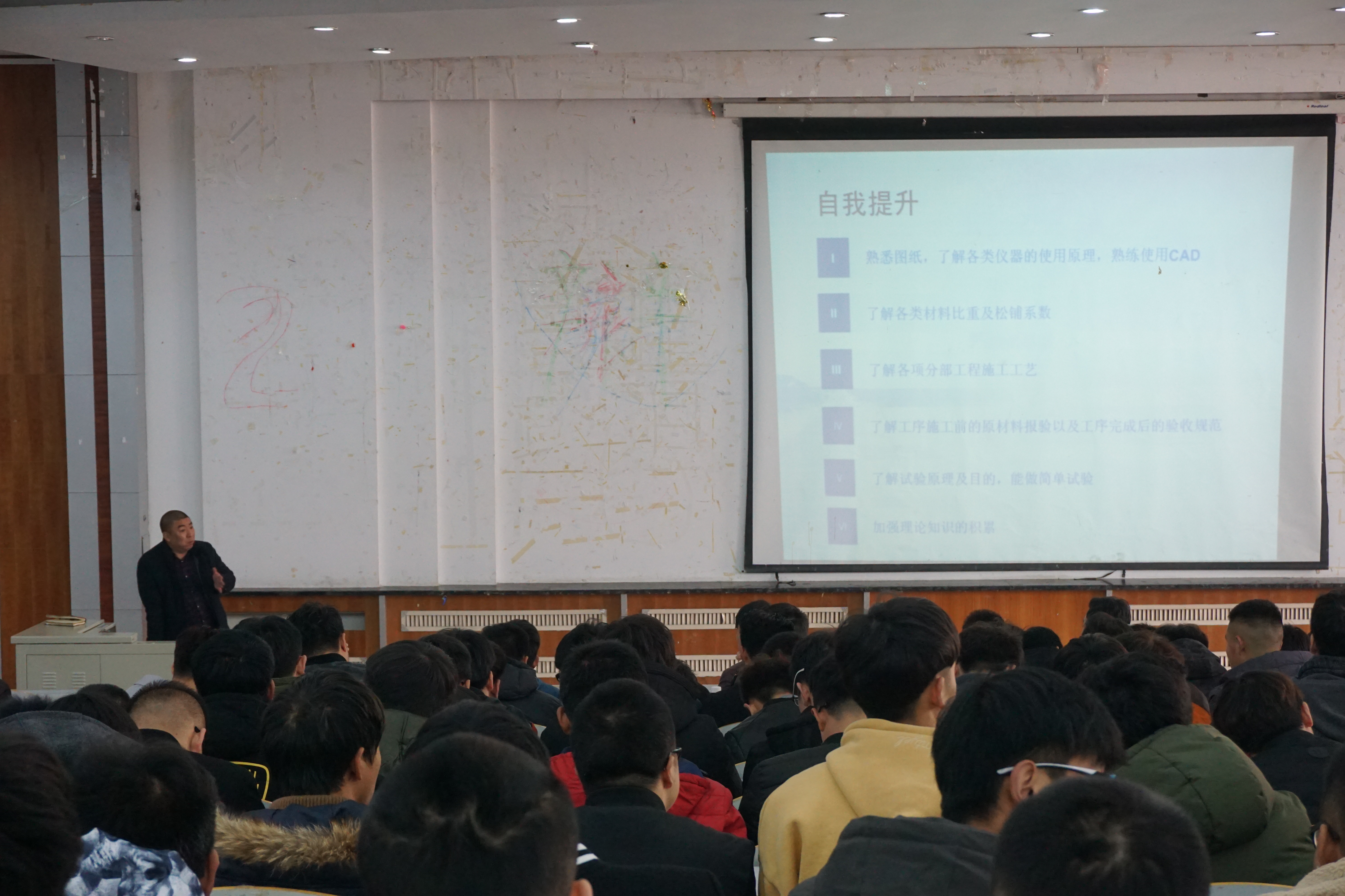 能源与BETVLCTOR伟德国际1946“成长之路”系列教育讲座第一讲于2月13日在教三楼西阶梯教室隆重举行,道路桥梁工程技术专业04-4班毕业生、江苏龙典建设集团有限公司项目经理褚忠海为路桥15级同学做专题讲座。