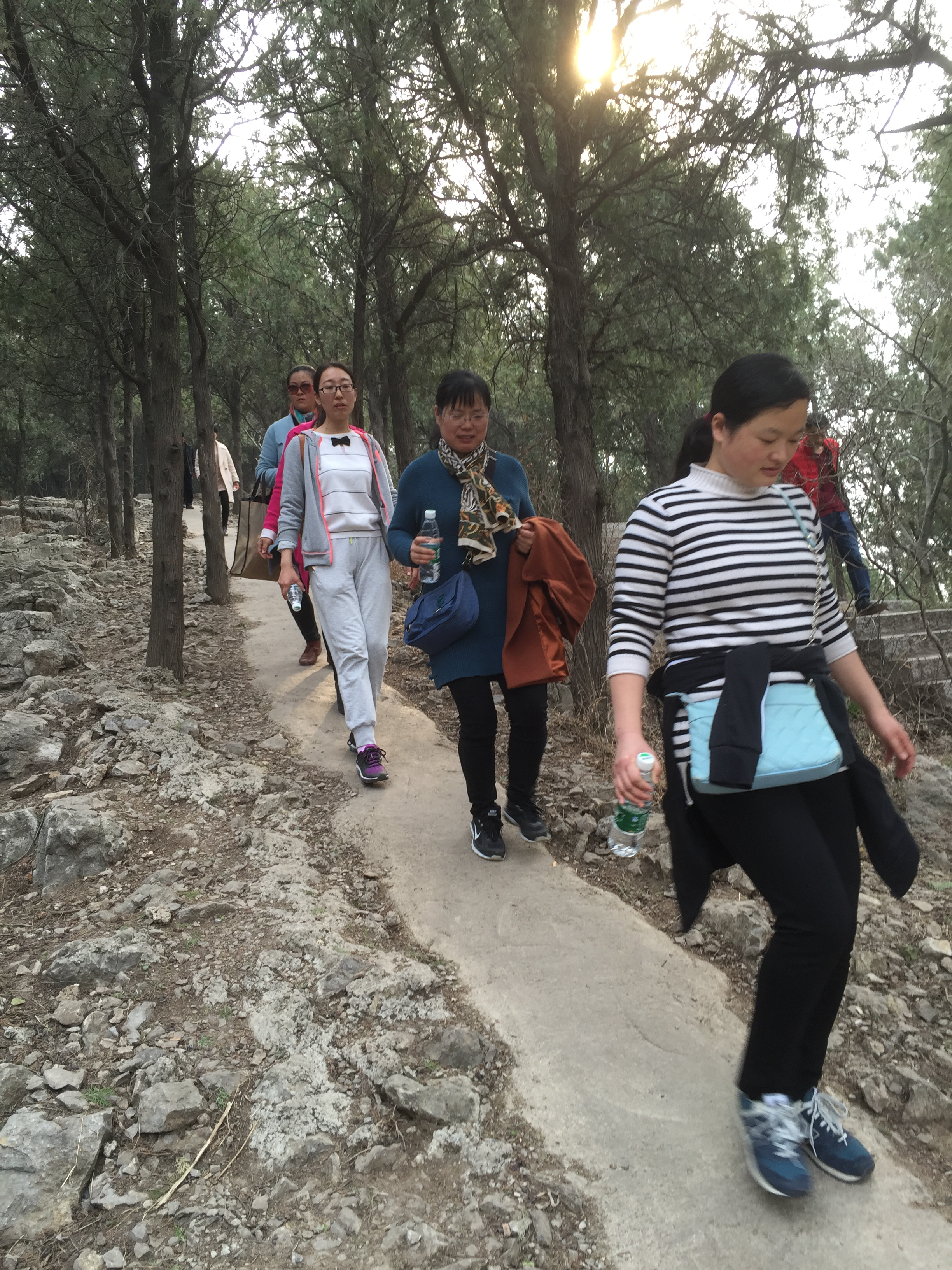 沐浴着温暖阳光,呼吸着山间清新的空气,大家热情高涨,你搀我扶,克服崎路险峰,向山顶快乐前行。