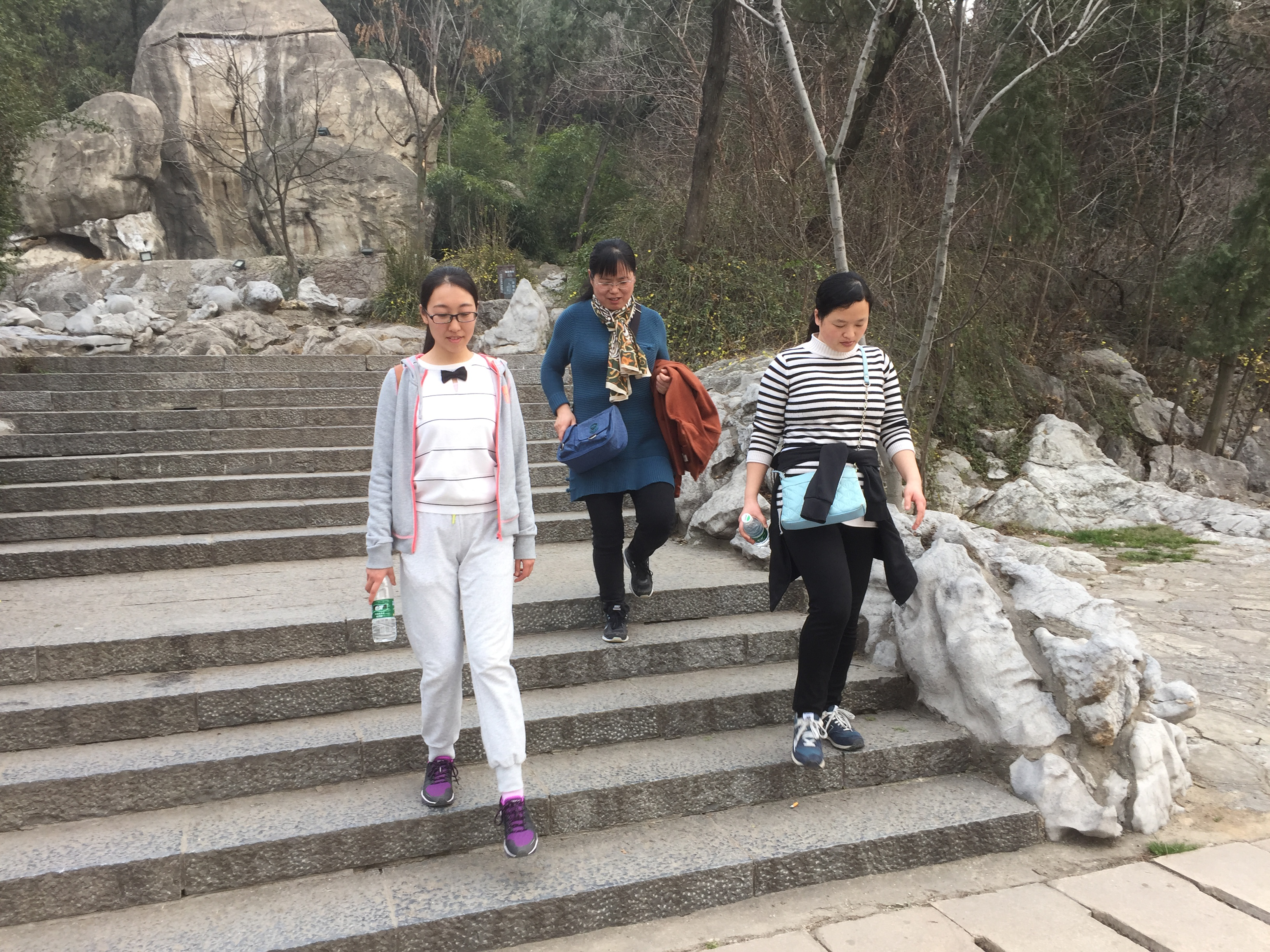 一边呼吸新鲜的空气,一边饱览秀山美景,尽情享受着登山的乐趣。大家三五成群结伴而行,或拾级而上,或边攀爬边开心的聊天,或在山中溪边合影留念,虽然初春咋寒,大家却是精神饱满,意趣盎然。