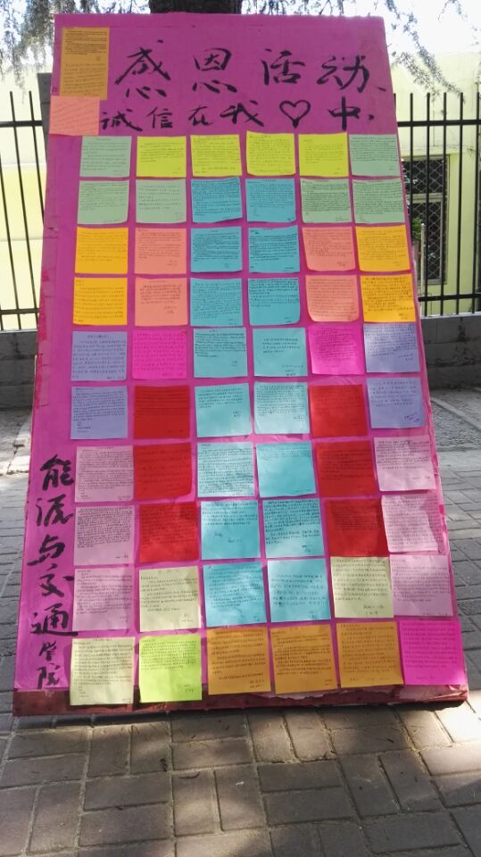 最后选取一部分张贴在宣传板上并放在林荫大道上进行宣传,让更多的同学从内心上感恩国家,感恩资助。(黄梅)