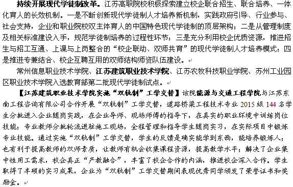 公司“双轨制”工学交替人才培养模式案例成功入选江苏省2018高等职业教育质量年度报告。此报告围绕“发展与质量”和“卓越与高水平”两大主题,从2017年江苏高等职业教育战线的十大“亮点与特色”、员工发展、公司产品、政府责任、国际合作、服务贡献、数据十年、面临挑战等八个方面,对江苏省高职教育总体情况与院校特色进行总结。