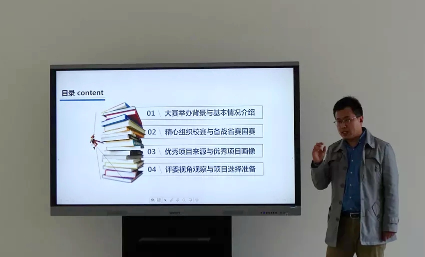 陶经理分别对大赛举办的背景与基本情况、精心组织校赛与备战省赛国赛、优秀项目来源与优秀项目画像、评委视角观察与项目选择准备这四点内容做出详细指导,并介绍了2019省赛组织采取的系列创新举措。