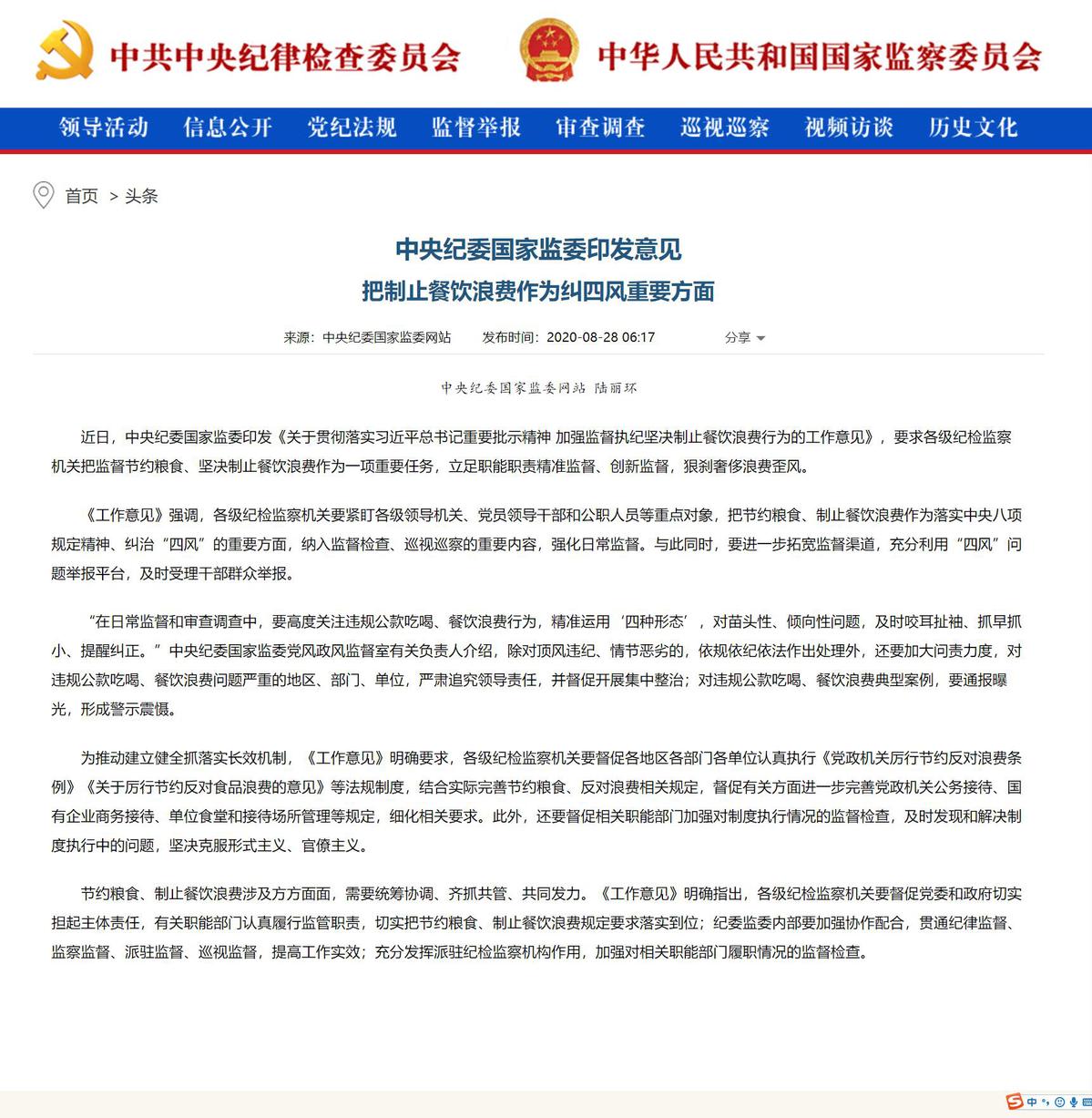 中央纪委国家监委印发意见:把制止餐饮浪费作为纠四风重要方面