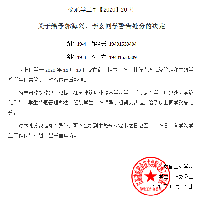 关于给予郭海兴、李玄同学警告处分的决定