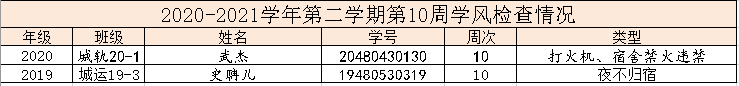现将公司2020-2021学年第二学期第10周的文明修身检查结果进行通报,希望广大同学引以为戒。