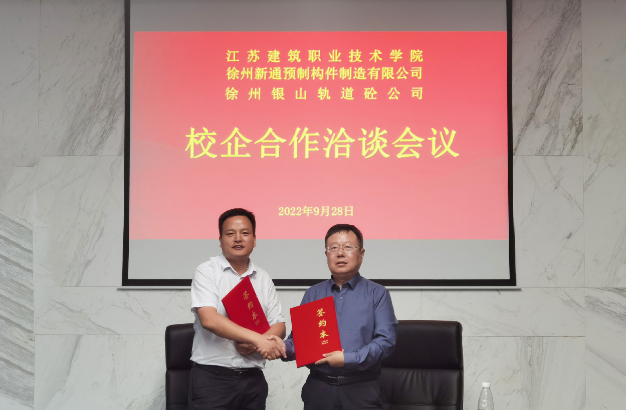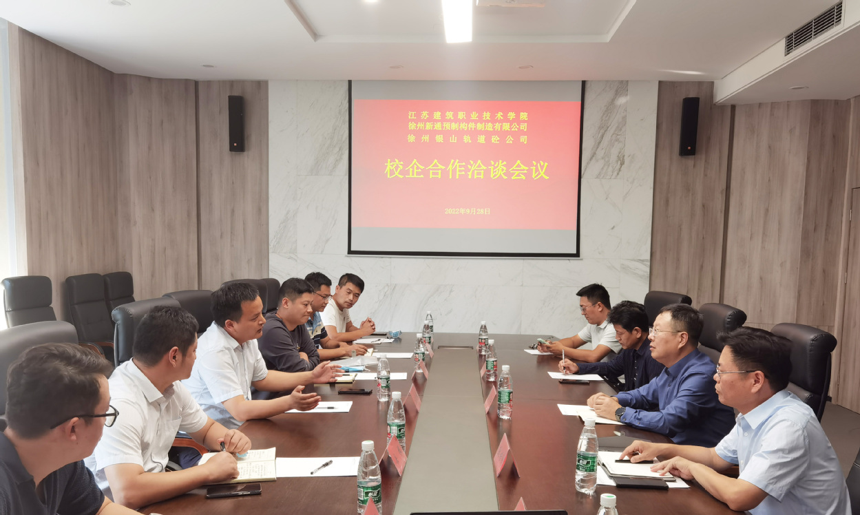 2022年9月28日下午,我院与徐州新通预制构件制造有限公司、徐州银山轨道砼公司在科技园会议室D116开展校企合作洽谈会。经理王国安、徐州新通预制构件制造有限公司兼徐州银山轨道砼公司总经理胡恒帅出席了会议,公司相关老师、企业相关部门负责人参加了洽谈会,会议由王国安主持。