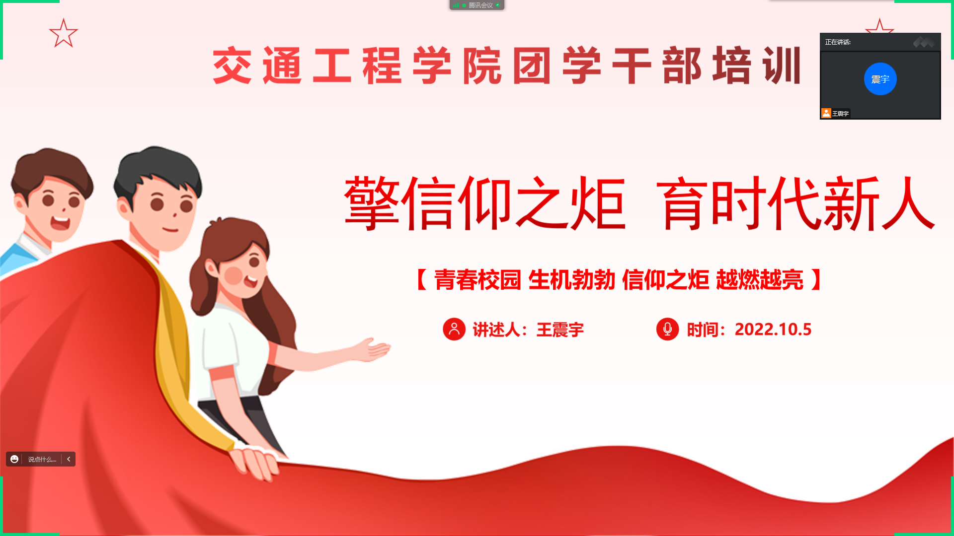 为进一步提高公司团学干部政治意识和服务意识,加强基层各部的凝聚力和向心力,坚定四个自信,做到两个维护,公司于2022年10月5号晚上7:30在线上举行团学干部培训。参加本次培训的有分团委书记王震宇、BETVLCTOR伟德国际1946员工会全体员工干部及各团支部书记。