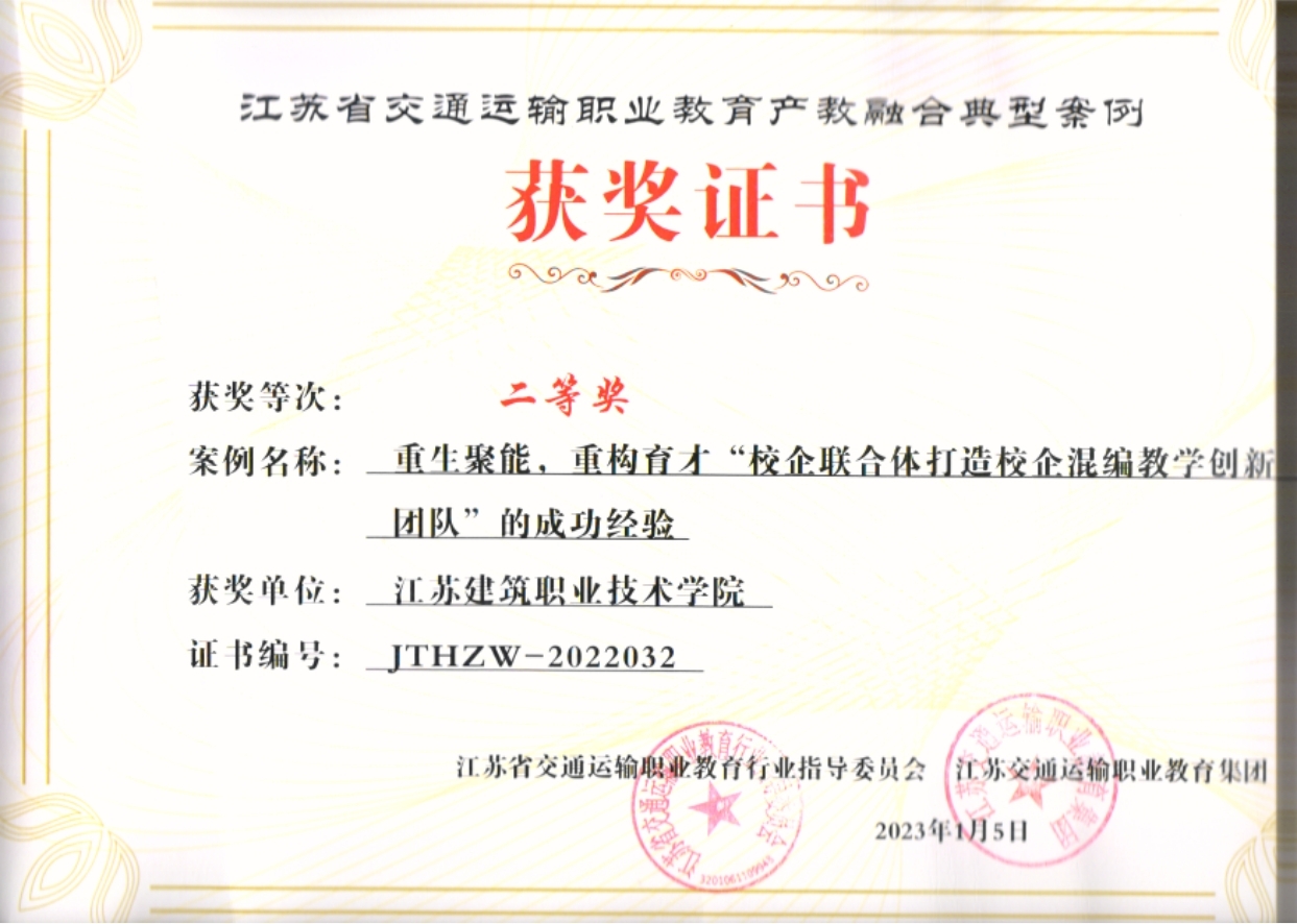 根据江苏省交通运输行指委2022年度工作安排,在全省广泛遴选校企合作典型案例,公司报送的“重生聚能,重构育才”——“校企联合体打造校企混编教学创新团队”的成功经验典型案例,经江苏省交通运输行指委组织专家评审,推选为二等奖。