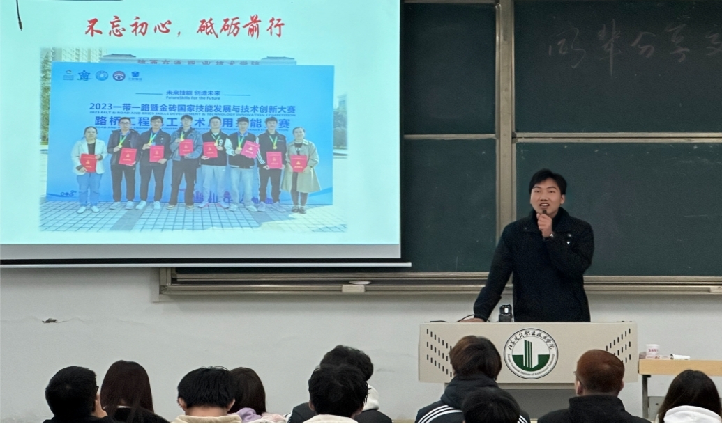 2022级城轨专业的胡广振结合自身经历,从参加励志奖学金评选、职业技能大赛、社会志愿服务等方面向同学们传授经验。他们讲述自己在求学过程中的坚持不懈、克服困难的励志故事,引起同学们的共鸣,勉励更多学子在追求梦想的道路上踔厉奋发、奋勇前行。