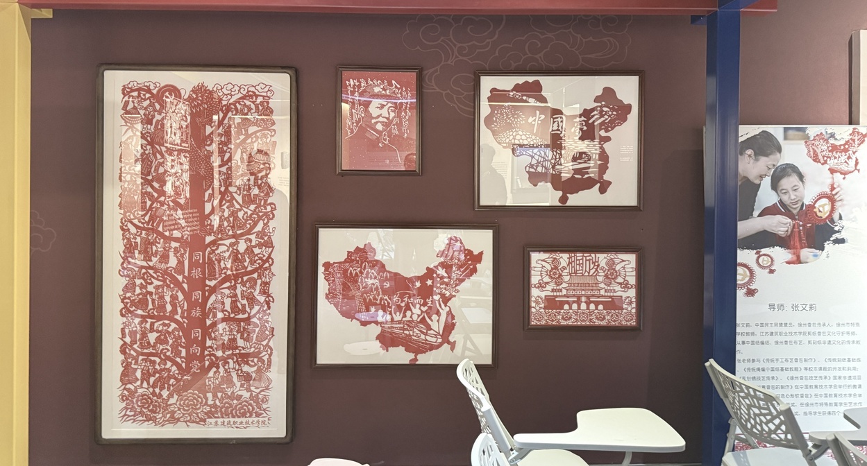 最后,师生们来到了“守护传习”展区。这里展示了徐州本地看得见、摸得着、学得会、传得下的非遗文化。有世界非遗徐州剪纸、国家级非遗徐州香包、省级非遗汉王石刻等。