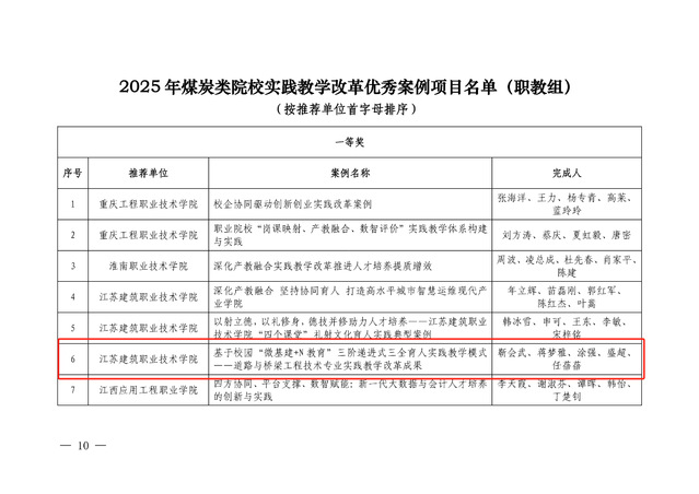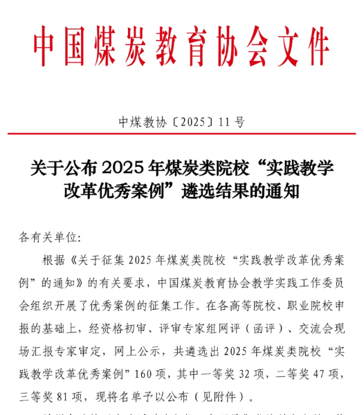 近期,公司在中国煤炭教育协会举办的2025年煤炭类院校实践教学改革优秀案例评比活动中获得职教组一等奖,获奖教师团队为靳会武、蒋梦雅、涂强、盛超、任蓓蓓老师(获奖项目名称:基于校园微基建+N教育”三阶递进式三全育人实践教学模式——道路与桥梁工程技术专业实践教学改革成果)。