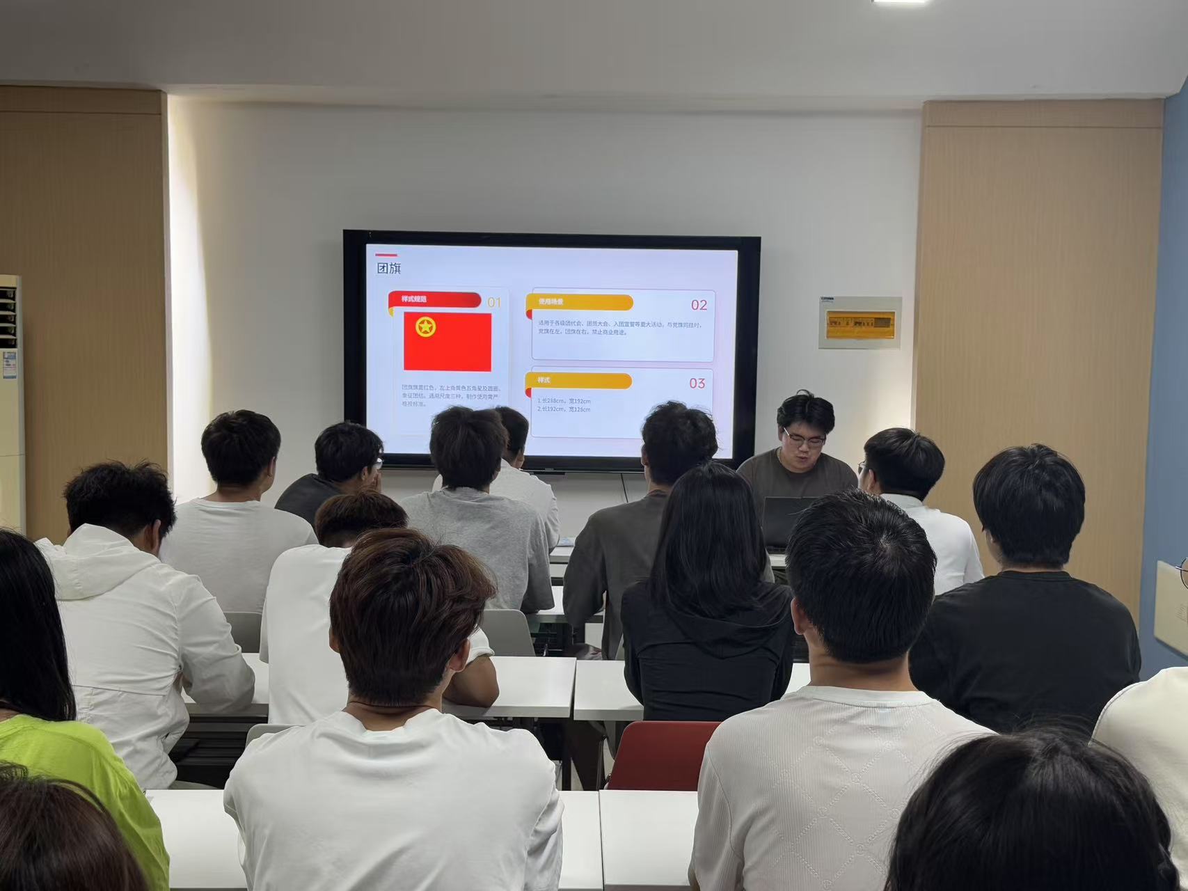 培训会上,冯蕾滔同学以《共青团基层团务工作指引》为主题,重点围绕团旗团徽规范使用、团员发展流程、基层团组织建设等七个方面进行详细讲解。在团旗团徽使用规范方面,明确了三种通用尺度及重大活动场景的悬挂要求,特别强调了禁止商业用途的管理规定。