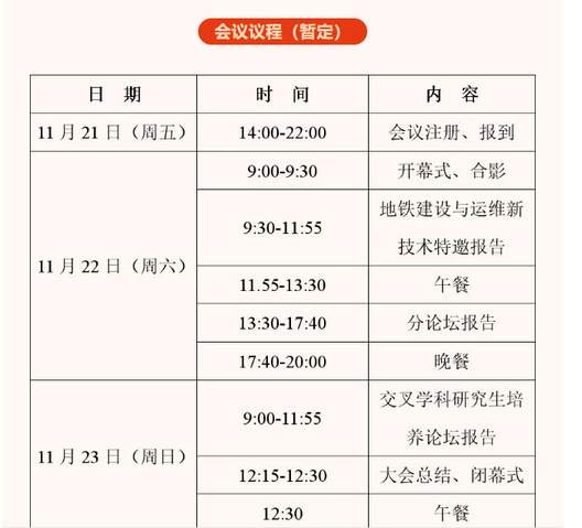 第七届地铁建设与运维新技术学术论坛于2025年11月21日-11月23日在江苏徐州召开。本届会议邀请在地铁建设与运维、地下空间开发与利用、隧道工程灾害与防治等领域的研发、设计、施工及教育领域的国内外知名专家、学者,以及来自国内外地铁公司、科研院所、施工单位和设备生产厂家的专业人士参加。旨在通过深入的学术交流和经验探讨,为地下交通工程的智能建造、灾害防控与健康运维提供策略、方案与相关经验,并为青年学者提供一个新理念、新技术、新成果的创新交流平台。一同努力,使我国地下交通工程建设更加智能、安全、绿色、高效!欢迎全国从事地铁建设或相关工作的专家出席本届会议。